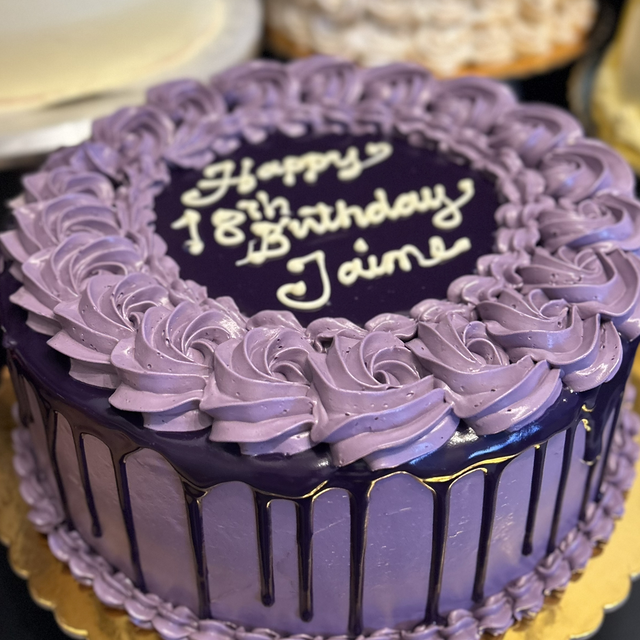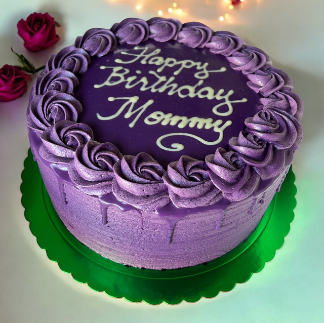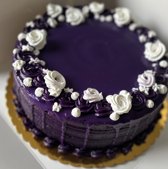 3 layers of delectable purple yam jam filled cake with tasty french buttercream frosting.